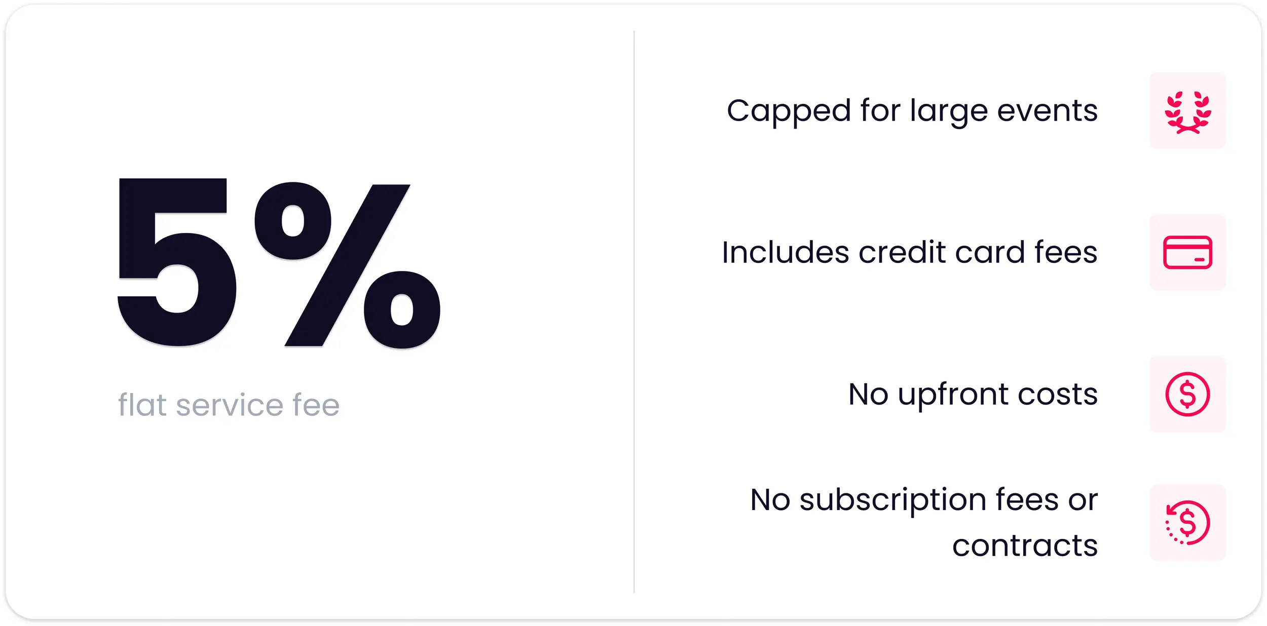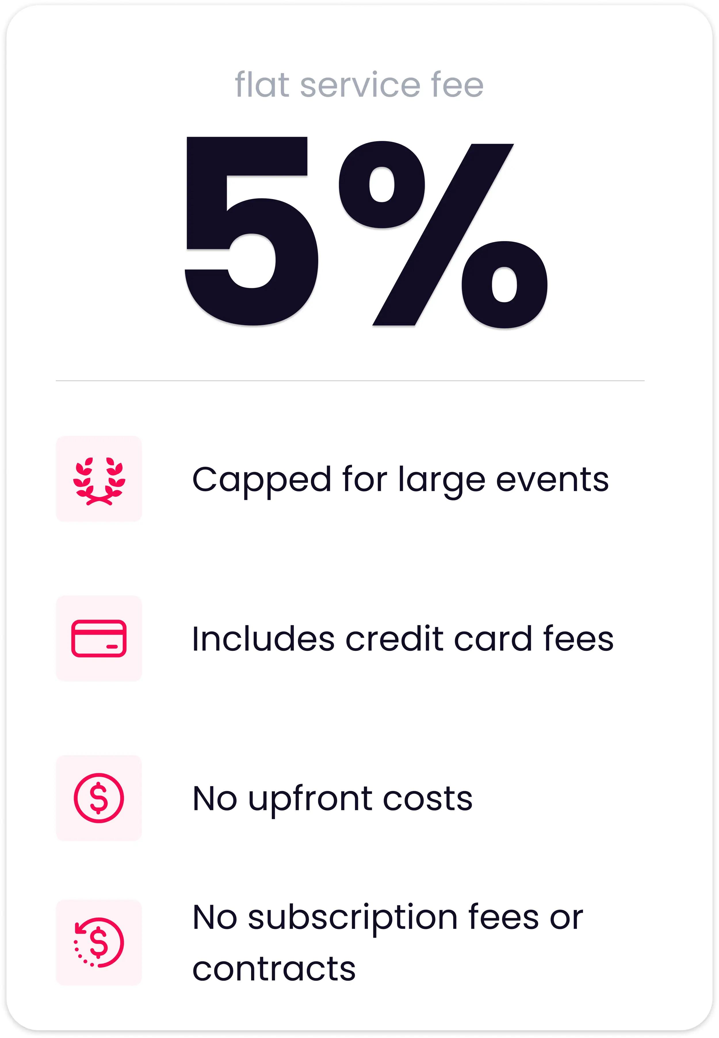 When your event ends and you transfer your earnings to your bank account, we keep 5% (which includes the credit card fee).
